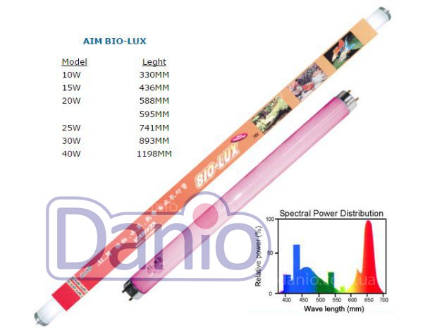 Лампа BIO-LUX 20 W идеально подходит для аквариумов-травников и аквариумов с большим количеством зеленых растений. Она способствует активности аквариумных обитателей, влияет на улучшение процесса фотосинтеза. Лампа излучает видимый розовый свет.