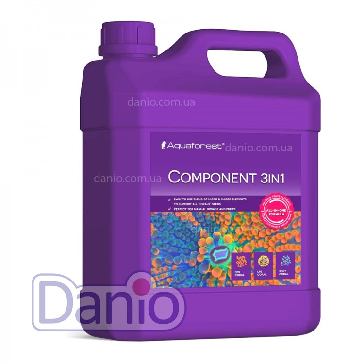Aquaforest Component 3in1 2000мл - это комплексный продукт, содержащий макро- и микроэлементы, разработанный специально для морских аквариумов. Он создан на основе метода Баллинга и включает в себя высококонцентрированные кальций, магний и карбонатную жесткость (KH) в пропорциях, которые точно соответствуют потребностям кораллов. Component 3in1 также содержит органические соли кальция, действующие как источник углерода для морских аквариумов.